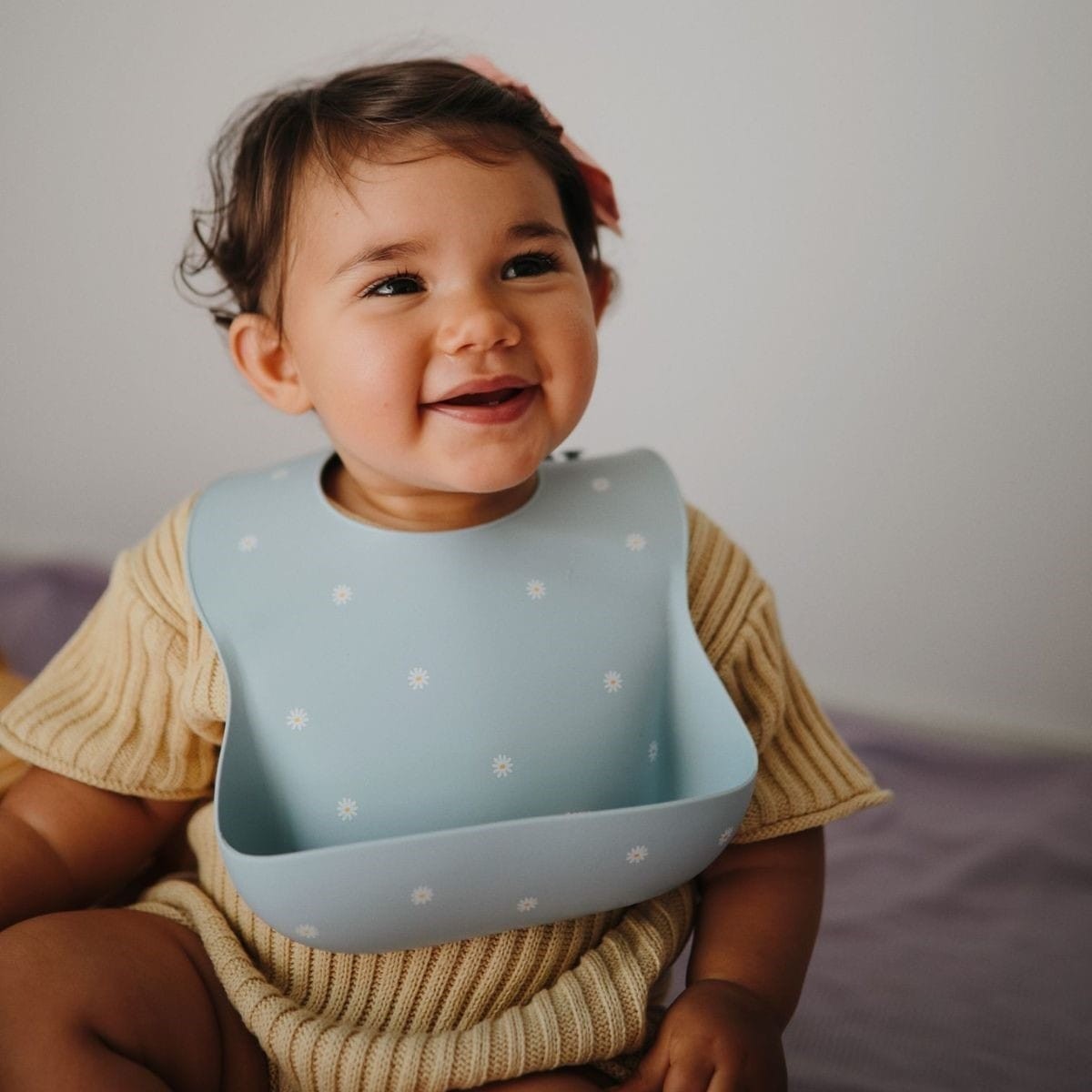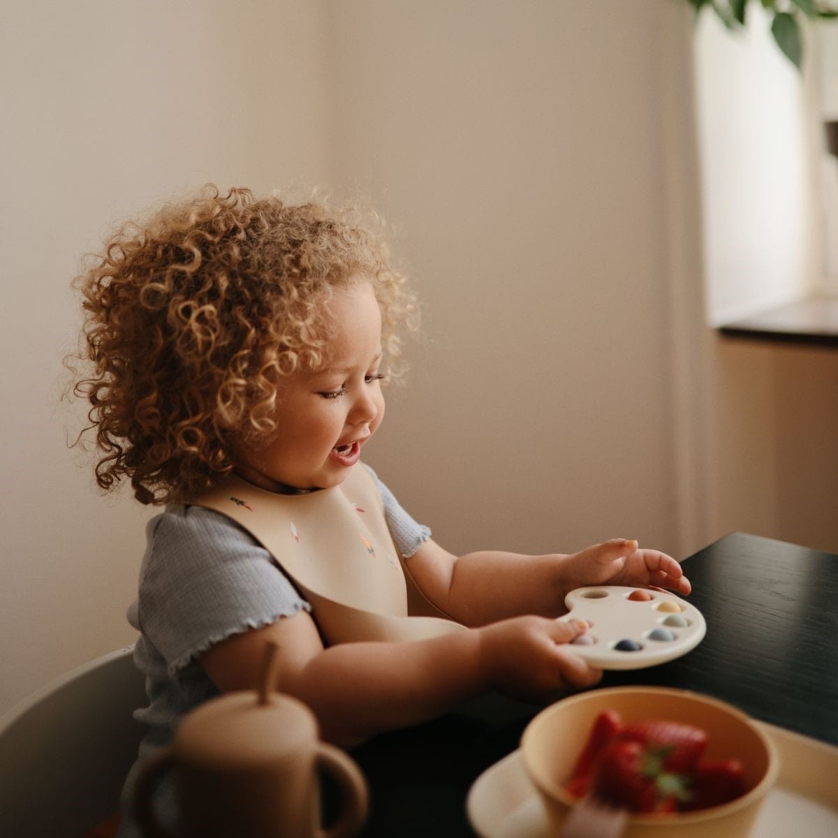 Bavoir en siliconne de la marque Mushie. Avec une poche profonde pour éviter que la nourriture tombe au sol