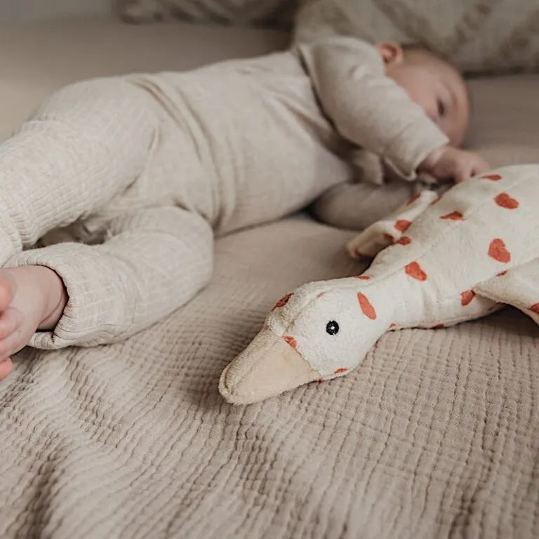 Peluche Oie Liva de chez Flow Amsterdam. Compagnon parfait pour accompagner les nuits de bébé et apaiser ses premiers instants de sommeil