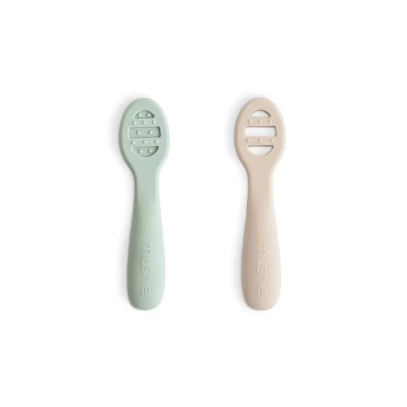 Lot de 2 cuillères de chez Mushie. Ce sont les premières cuillères pour bébé. Ce lot contient 2 cuillères pour différentes étapes de diversification